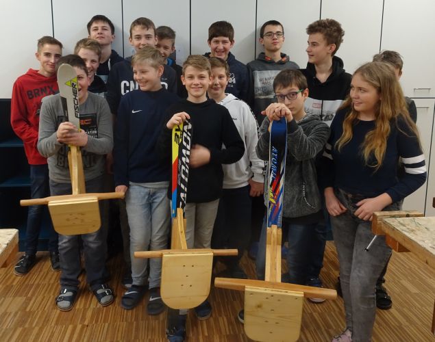 Zuerst sahen wir (SchülerInnen der 4. Kl) uns im Internet ein Video und einige Bilder vom Schibock an. Im Anschluss wurde der Aufbau besprochen. In der nächsten Werkstunde hatten alle Schüler einen Schi mit und es ging mit dem Teile zuschneiden los. |