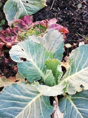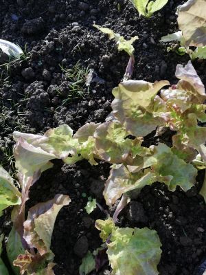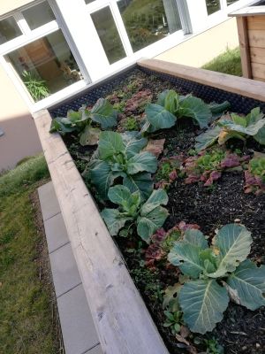 Das zweite Hochbeet wurde mit Wintersalat und Winterkraut bepflanzt. Diese wachsen noch bis in den Spätherbst, bilden nach dem winterlichen Wachstumsstopp im Frühling Köpfe und können ab April 2020 geerntet werden. Hier wurden zwischen den kleinen Pflänzchen Radieschen gesät, die es Anfang Oktober 2019 zu ernten gab. |