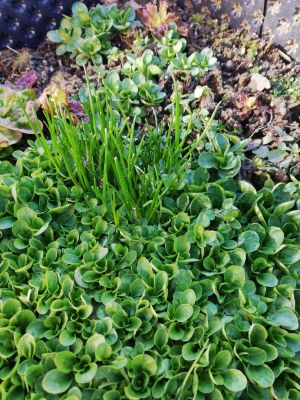 Im ersten Hochbeet wurden am Rand Pflücksalat-Pflanzen und Schnittlauch gepflanzt und in der Mitte Winterheckenzwiebel, Vogerlsalat und Winterpostelein gesät. Winterpostelein schmeckt ähnlich wie Vogerlsalat, ist leichter zu ernten und wächst bis zu 4-mal nach. |