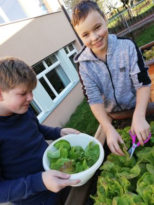 Den Pflücksalat konnten wir fast bis Weihnachten 2019 ernten. Die Ernte war so ertragreich, dass dieser und der Winterpostelein für die Verarbeitung und den Genuss im Fach Ernährung und Haushalt unserer 3. und 4. Klassen reichten. Ende Oktober 2019 wurden hier zwischen den Pflanzen Petersilie und Erbsen gesät. |