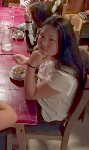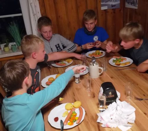Später warteten wir ca. zwei Stunden auf unser Abendessen, dass sehr lecker war (Backerbsensuppe, Würstel mit Kartoffelrösti, Spaghetti und Eis). |