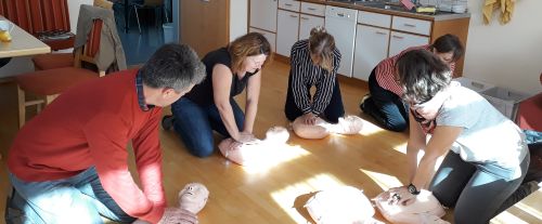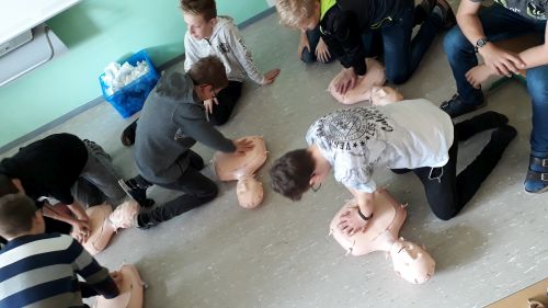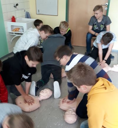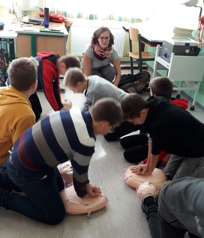 Unter dem Motto „Jeder Mensch kann Leben retten“ bekamen alle 155 Schülerinnen und Schüler zuerst grundlegende Informationen über Wiederbelebung. Daraufhin übten sie mit vollem Einsatz die Herzdruckmassage an Übungspuppen – begleitet vom Song „Stayin`alive“ (Bee Gees), der den richtigen Rhythmus vorgab. |