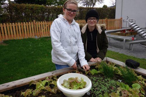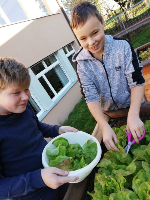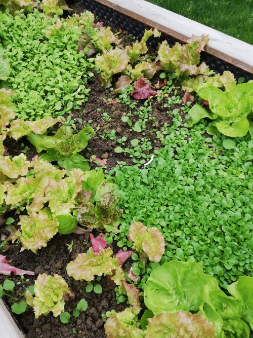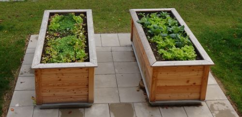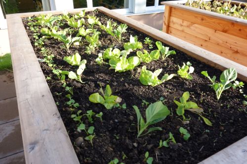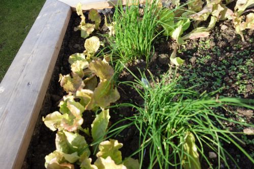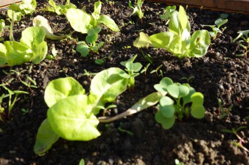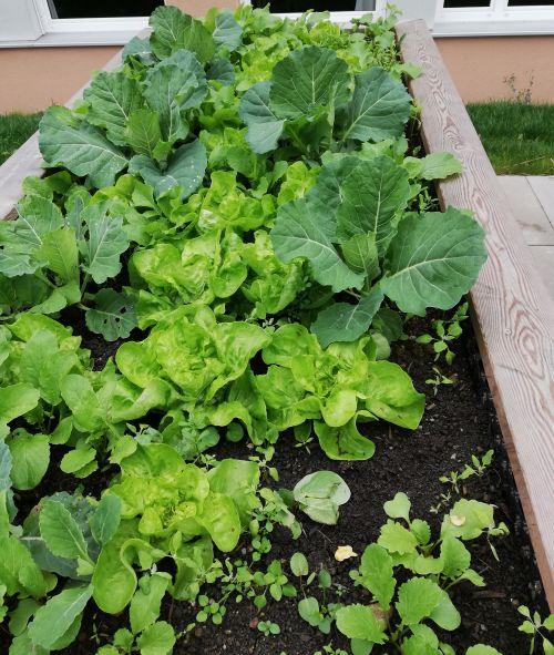 Am ersten Hochbeet wurde Wintersalat gepflanzt und Radieschen gesät. Radieschenernte war im Oktober. |