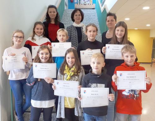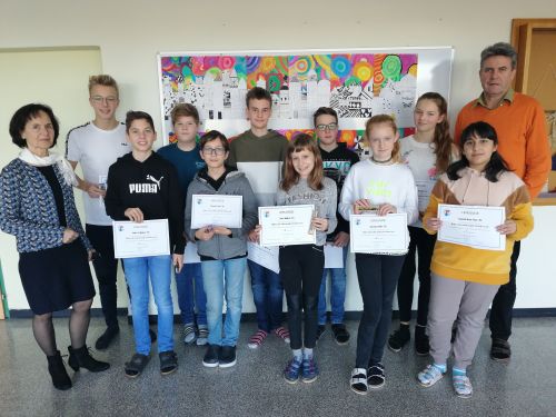 Die SiegerInnen der Gruppe Benjamin (1. + 2. Klasse): 1. Marlene Burgstaller (2a) 2. Robin Kalischko (2b) 3. Moritz Eder (1a) 6. Moritz Peer (1a) 7. Bettina Hofer (1a) 8. Jasmin Reiter (2b) 9. Magdalena Kehrer (1b) 10. Tobias Kaltenböck (1a) Frau Auinger, Frau DNMS Lindorfer, Frau Gabriel