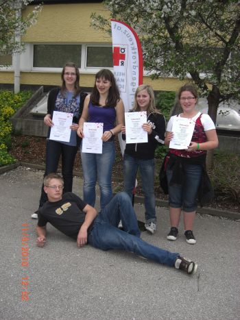 Ein ganz besonderer Dank gilt unserem Erste- Hilfe- Kurs- Leiter Herrn Schleiffelder für die Freizeitopferung und Geduld mit uns. Wir danken auch der Handarbeitslehrerin Frau Reiter, die uns in ihrer Handarbeitsstunde die Dreiecktücher machen ließ und unserem Begleitlehrer Herrn Habringer. |