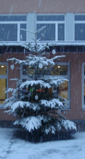 Als Frau Holle sah, dass der Baum so schön geworden war, ließ sie gleich die ersten Federn aus ihren Kissen fallen. Wir haben den Baum also genau zur richtigen Zeit aufgestellt |