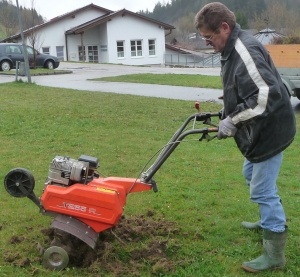 Hr Manfred Dorfner fräst zwischen Volksschule und Hauptschule ein Beet um. |