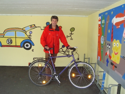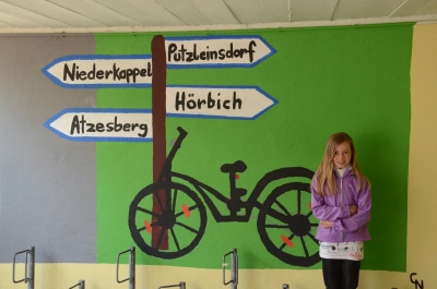 Im Zeichenunterricht wurden Motive für die neue Radgarage gemalt. Die Zeichenlehrer/innen und die Klassensprecher/innen wählten die fünf schönsten Bilder aus. Mit dem Original als Vorlage wurden diese dann an die Wand der Garage vergrößert gezeichnet.