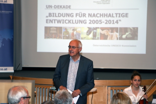 Dr. Helmuth Hartmeyer, ADA und Vorsitzender des ÖUK-Fachbeirats „Bildung für Nachhaltige Entwicklung und Globales Lernen“ leitete die Auszeichnung. |