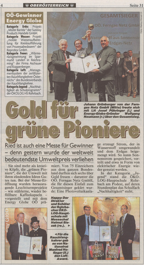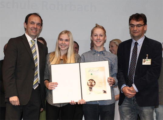 In der Kategorie Jugend konnte das Konzept der ÖKOLOG Hauptschule Rohrbach die Juroren überzeugen. Der Weg führt weg von Einzelprojekten hin zur gelebten Schulkultur. Bewusstseinsbildung bei Schülern ist der Schlüssel für Verhaltensveränderungen. Landeshauptmann Dr. Josef Pühringer bei der Übergabe der Urkunde Im Sinne eines Miteinanders von Mensch, Umwelt und Wirtschaft fanden verschiedenste Aktionen im Bereich der Nachhaltigkeit statt. Smiley- und Gurkenzangenaktion dienen der Sauberkeit im und rund ums Schulgebäude, der Besuch in sozialen Einrichtungen öffnet den Blick für benachteiligte Menschen, Gesundheits- und Verkehrserziehung sind weitere Bausteine der Lernkultur. Für die Region und mit der Region arbeiten ist ein wichtiger Aspekt der ÖKOLOG-Hauptschule Rohrbach, der nur gelingen kann, wenn alle Beteiligten für diese Idee arbeiten.