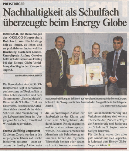 Die ÖKOLOG Hauptschule Lembach gratuliert der Partnerschule, der ÖKOLOG - Hauptschule Rohrbach, zum Gewinn des