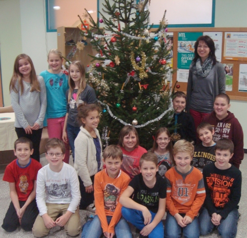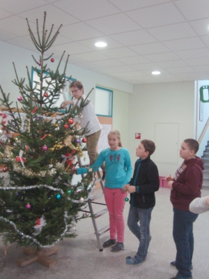 Schon 13 Tage vor Weihnachten steht ein schöner Christbaum in unserer Schule. Wir, die Schüler/innen der 1b, durften die hohe Fichte schmücken – mit Kerzen, glitzernden Girlanden und bunten Christbaumkugeln. Wir danken der Straßenmeisterei Lembach für den schönen Baum. |