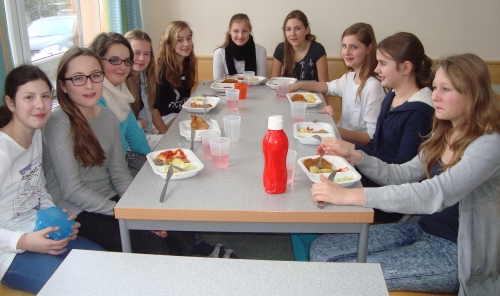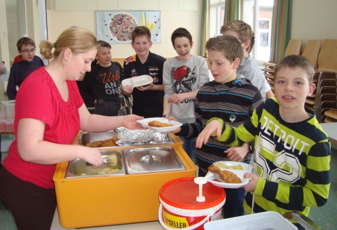 Jeden Wochentag außer Freitag eilen viele hungrige SchülerInnen mit knurrendem Magen in unseren Ausspeisungsraum. Hier teilt Frau Gerlinde G. vom Gasthaus Kislinger täglich das Essen aus. Den meisten Kindern schmeckt das Essen sehr, doch ein paar Schüler würden sich wünschen, dass die Zubereitung der Speisen fettärmer erfolgt. Unsere Lieblingsspeisen: Schnitzel, gebratene Knacka, Bratkartoffeln, Tortellini, Gemüselaibchen, gebackener Fisch, ... |