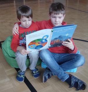 Christian Resch: Ich habe Robin das Buch „Der große Augenblick“ vorgelesen. Robin war sehr schüchtern, aber er hörte ganz gut zu. Ich durfte Robin dann zum Glück die Schule zeigen. Es würde mich sehr freuen, wenn wir wieder einmal den kleinen Volksschülern vorlesen dürften. |