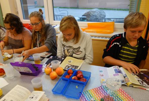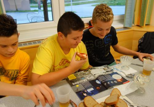 Am 25. September fand im Ausspeisungsraum für die 2. und 3. Leistungsgruppe der beiden 4. Klassen ein heiß ersehntes Lesefrühstück statt. Jeder hatte etwas Leckeres von daheim mitgebracht, z. B. Brot, Milch, Honig, Marmelade, Gurkenscheiben und Käse. Zum Trinken gab es heißen Kräutertee. |
