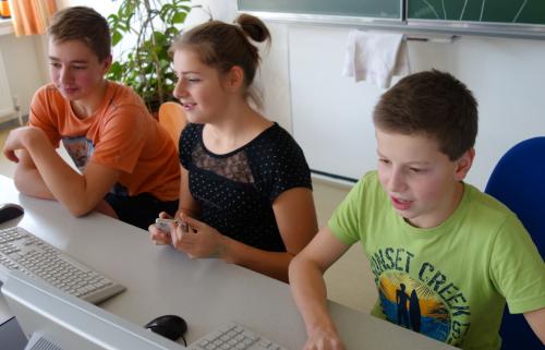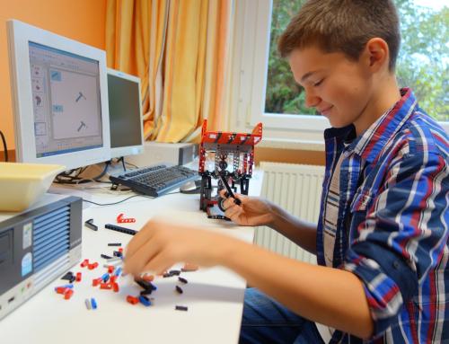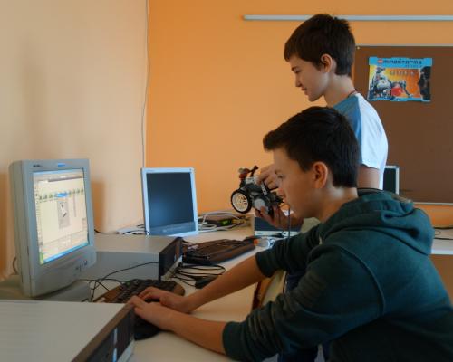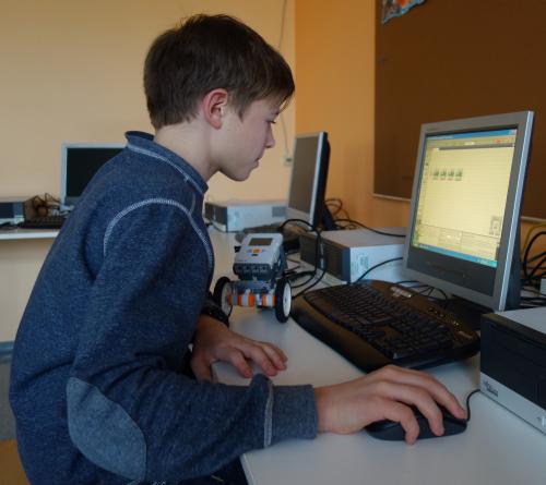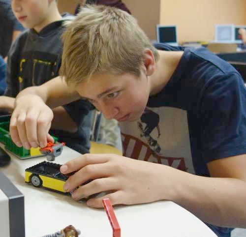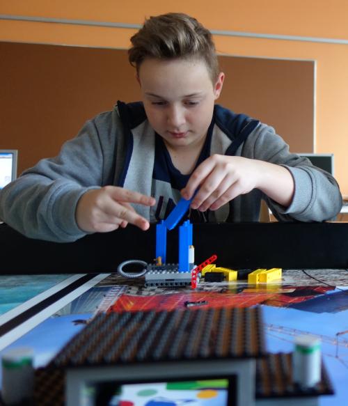 Eifrig werden die Elemente für das Spielfeld zusammengebaut. Der selbstgebaute Roboter wird die Aufgaben am Parcours sicherlich bravourös meistern. |