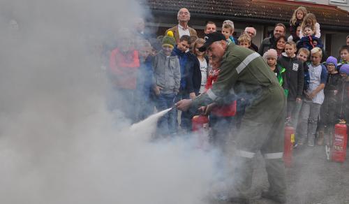 Ein weiterer Höhepunkt der turbulenten Science-Party war eine Brandlegung durch die Feuerwehr Lembach hinter dem Schulgebäude. FF-Kommandant Max Öller erklärte den Schaulustigen die fachgerechte Handhabung eines Feuerlöschers, mit dem die jungen Forscherinnen und Forscher die Flammen selber löschen durften. |