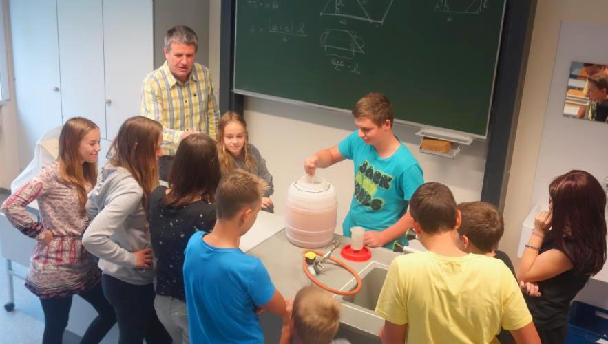 Am 03.10.2016 starteten wir, die 4a, das Projekt „Most“. Jürgen Obermüller war der Projektleiter. Er nahm ein Fass Süßmost in die Schule mit und im Chemie Unterricht wurde dann der Gärungsprozess vorbereitet. |