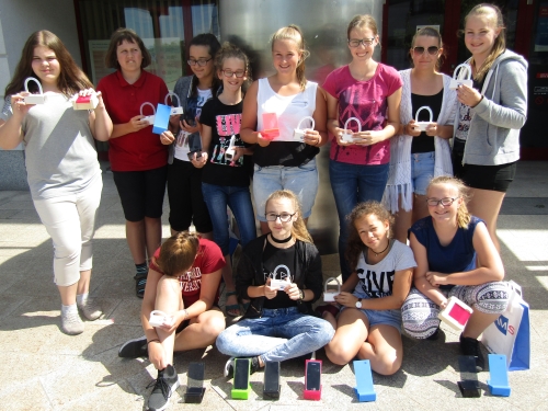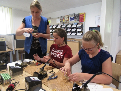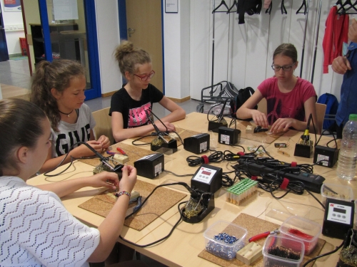 Wir bauten uns eine kleine Schatzkiste aus Holz, einen Handyhalter aus Plexiglas und einen LED-Regenbogen, der die Farben wechseln kann. Dazu lernten wir hobeln, löten, feilen und vieles andere mehr. |