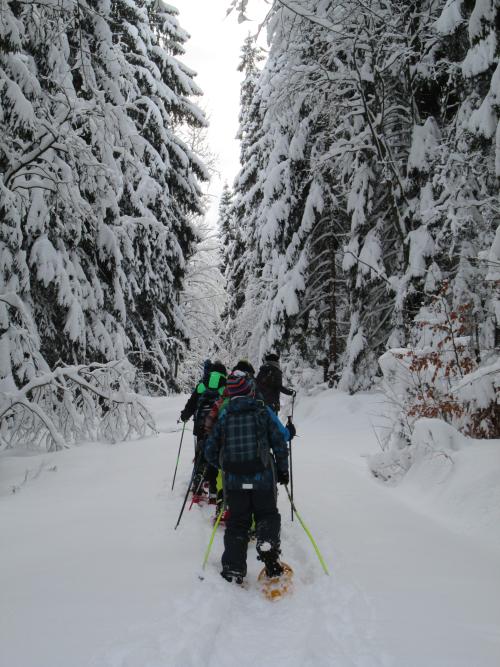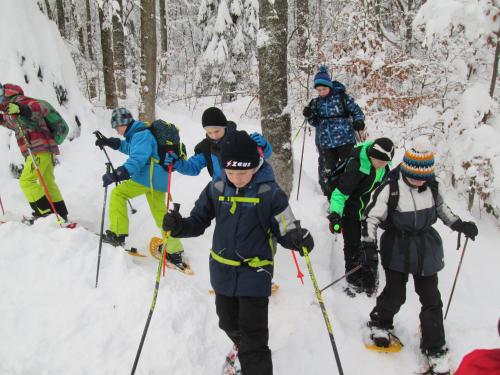 Spurensuche im Böhmerwald Am Dienstag, den 19.12.2017, sind wir - 1a/b Schülerinnen und Schüler vom Technik- und Naturwissenschaftlichen Schwerpunkt - zur Böhmerwaldschule nach Schöneben gefahren. Nach 45 Minuten Fahrt sind wir am Ziel angekommen. Dort haben sich die Lehrerinnen der Böhmerwaldschule vorgestellt und uns geholfen, die Schneeschuhe anzuschnallen. Danach ist es schon losgegangen. Nach 15 Minuten haben wir eine Rast gemacht. Später ging es mit einem Spurenversteckspiel im Tiefschnee weiter. Während eine Gruppe sich versteckte, holten die anderen einen Fuchsschädel, ein Rehgeweih, ein Wildschweinfell, einen Rehkiefer und ein Eichhörnchenfell aus einem Sack heraus, um es zu bestimmen. Der Schnee war nicht perfekt zum Spurenlesen, aber trotzdem konnten wir Hasen- , Reh-, und Fuchsspuren erkennen. Die andere Gruppe hat sogar einen Hirschkot gefunden. Am Ende der Wanderung wärmten wir uns bei einem großen Lagerfeuer wieder auf. Übrigens war der Tiefschnee ca. einen halben Meter tief. |