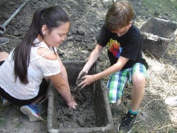 Als Erstes rührten wir Lehm, Stroh und Wasser zusammen. |