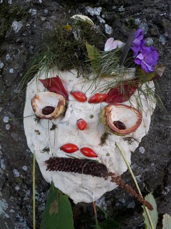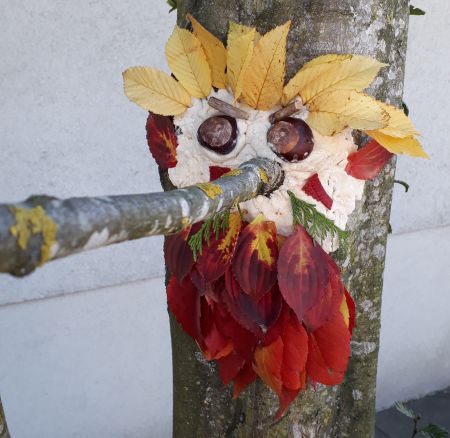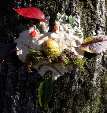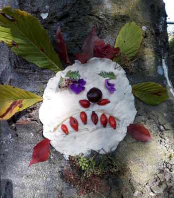 Wir haben den Salzteig auf den Baum geklebt und ein gruseliges oder fröhliches Gesicht gezaubert. |
