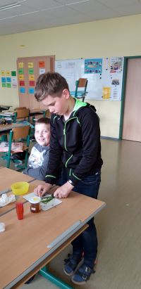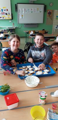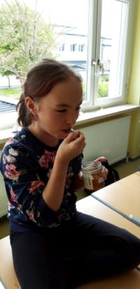 Die Schülerinnen und Schüler der 1.Klassen lernten im technischen Schwerpunkt Biologie einige essbare Frühlingskräuter kennen. Dabei durften die Kinder Löwenzahnhonig verkosten, der ihnen sehr gut schmeckte. Anschließend bereiteten sie einen Frühlingskräuteraufstrich und einen Frühlingskräutertee zu. Die Kinder waren erstaunt, dass es auf unseren Wiesen so viel Essbares zu finden gibt. Zum Abschluss wurden dann Aufstrichbrote und der Kräutertee verkostet. „Ich finde, der Tee und der Aufstrich waren ausgezeichnet. Es ist toll, dass wir im Schwerpunkt auch einmal etwas gekocht haben.“ (Katharina, 1b) „Mir hat die Stunde sehr gut gefallen, weil wir viel kosten durften. Alles hat sehr gut geschmeckt.“ (Sarah, 1b) |