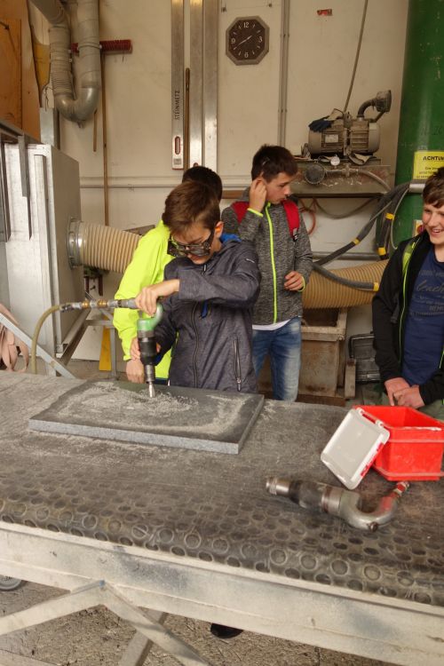 Daraufhin unternahm der Betriebsleiter Herr Leitner mit den jungen Besuchern einen Rundgang durch die Produktionsstätten der Fa. Strasser, die sich auf hochwertige Küchenarbeitsplatten und Grabsteine spezialisiert hat.