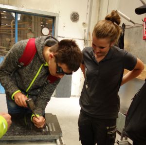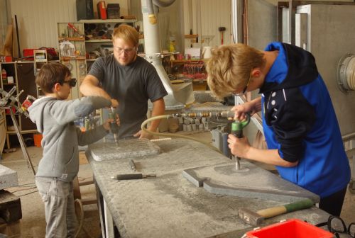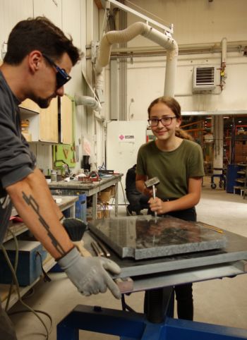 Sofort nach der Ankunft durften die Jugendlichen in die Werkstatt mit einem Stockhammer eine Granitplatte bearbeiten – unter Aufsicht von Steinmetz Thomas.